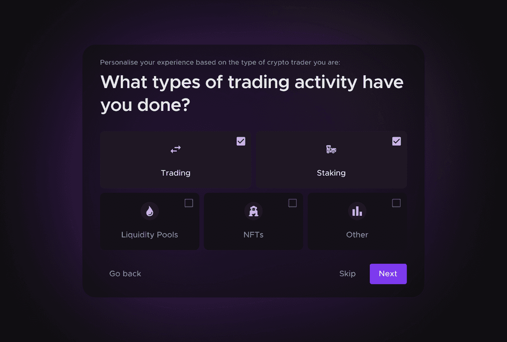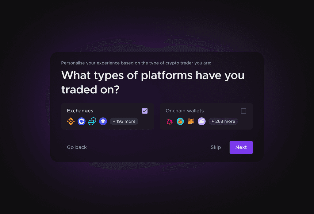 Insight: Letting users into the platform without connecting at least 1 exchange or wallet caused high cognitive load and no clear path to the "Aha" moment.