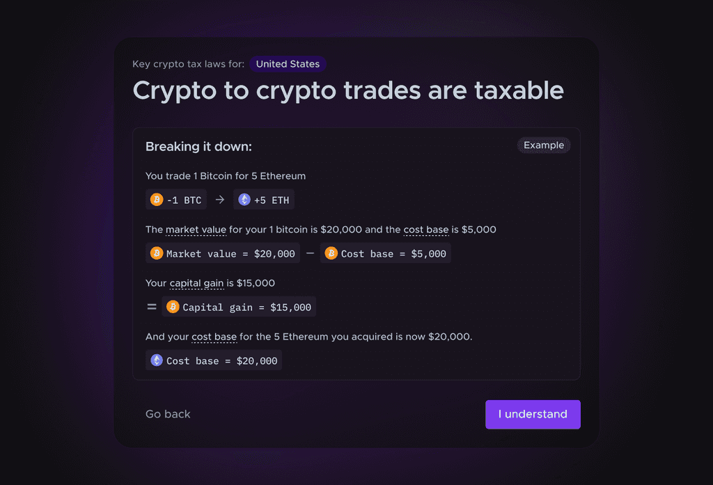 We distilled the highest impact knowledge gaps into key screens that educated users crypto taxes while introducing key terms they'll encounter through the product.